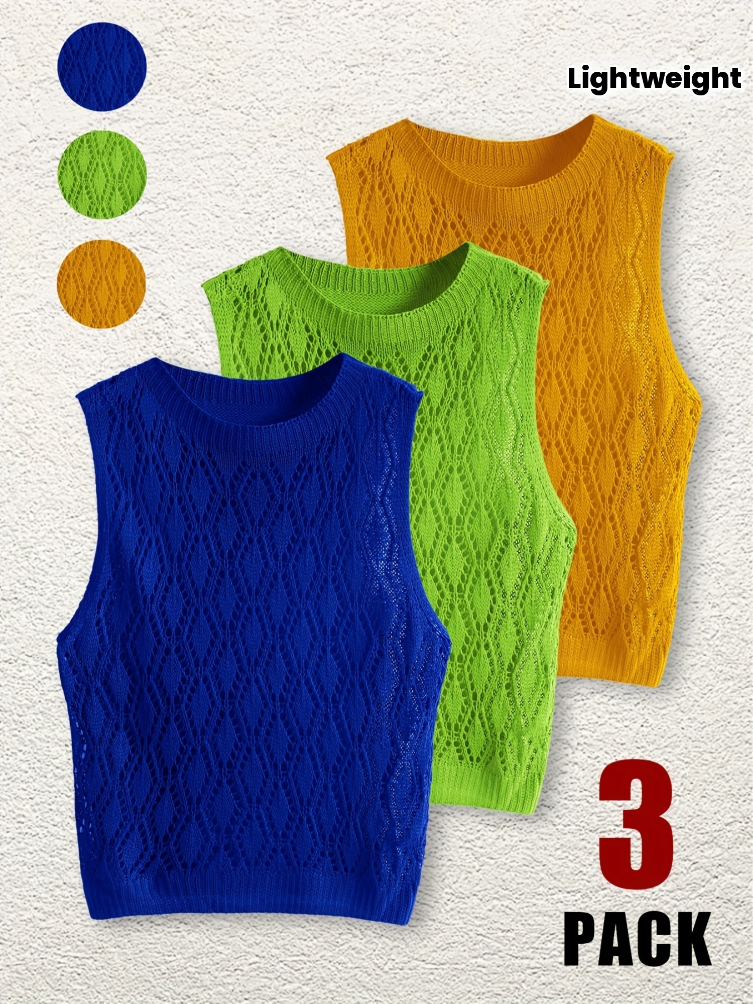 [3pc Summer Women's Set] TD7866-1T Women's Summer Three-Piece Set | Fashionable Lightweight Hollow Knit Pullover & Beach Vacation Tank Top