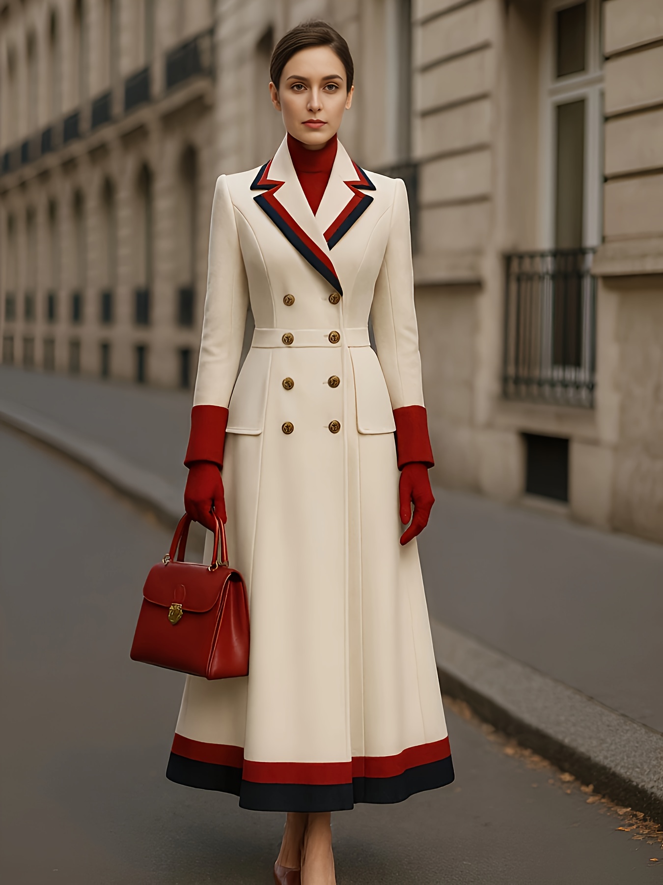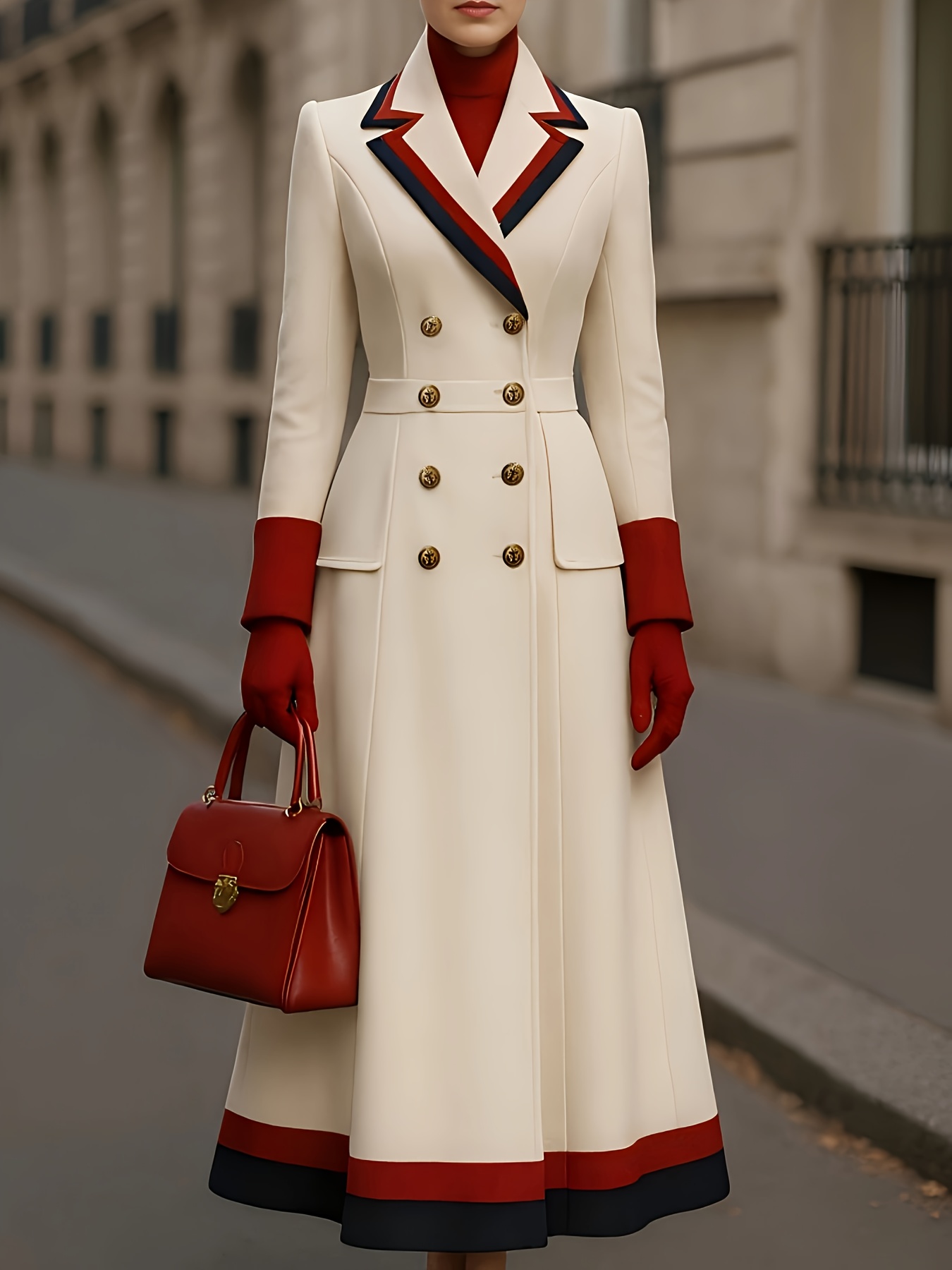 Fashion Trendy Color Blocked French Style Metal Double-Breasted Longline Peacoat