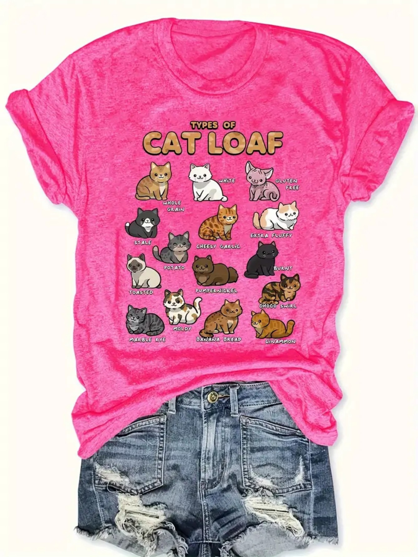 [Pink Cat Tshirt] Bright Pink Women's Cat Lover Graphic T-Shirt | Short Sleeve Crew Neck Casual Top with "Take Me to Cat Loaf" Print & Breed Illustrations, Machine Washable Summer & Spring Tee, Soft Fabric, Playful Design