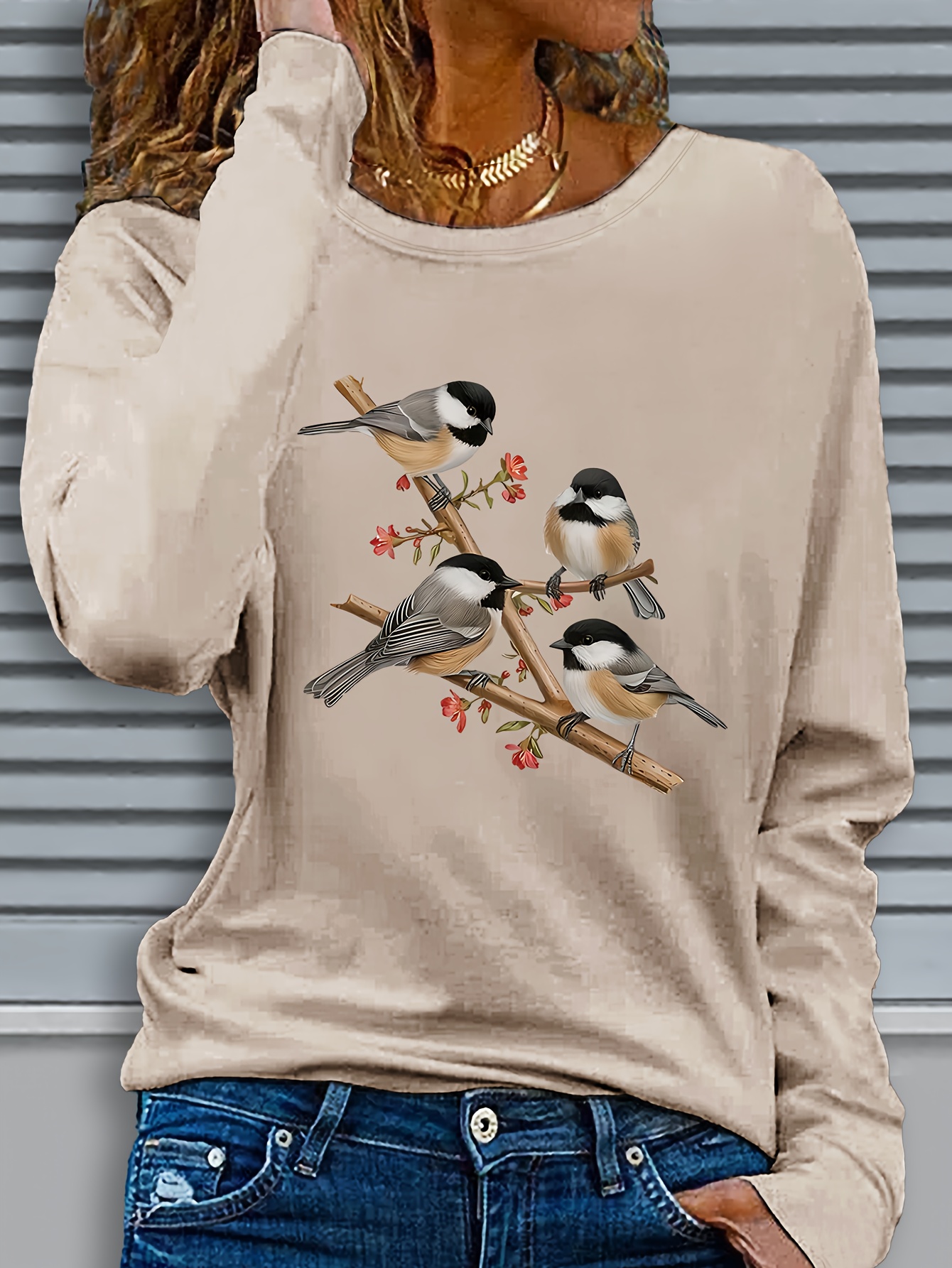 Women's Black Long Sleeve Crew Neck T-Shirt with White & Grey Titmouse Bird & Red Berry Graphic Print - Soft Casual Fall Winter Top, Machine Washable Everyday Comfortable Shirt for Nature-Inspired Outfits