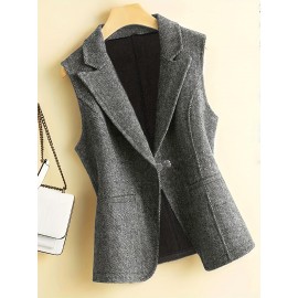Women'S Elegant Sleeveless Flat Collar Button Front Jacket with Faux Pockets - Cozy Brown Plaid Pattern, Long Length, Perfect for Fall/Winter Casual Wear, Winter Clothes