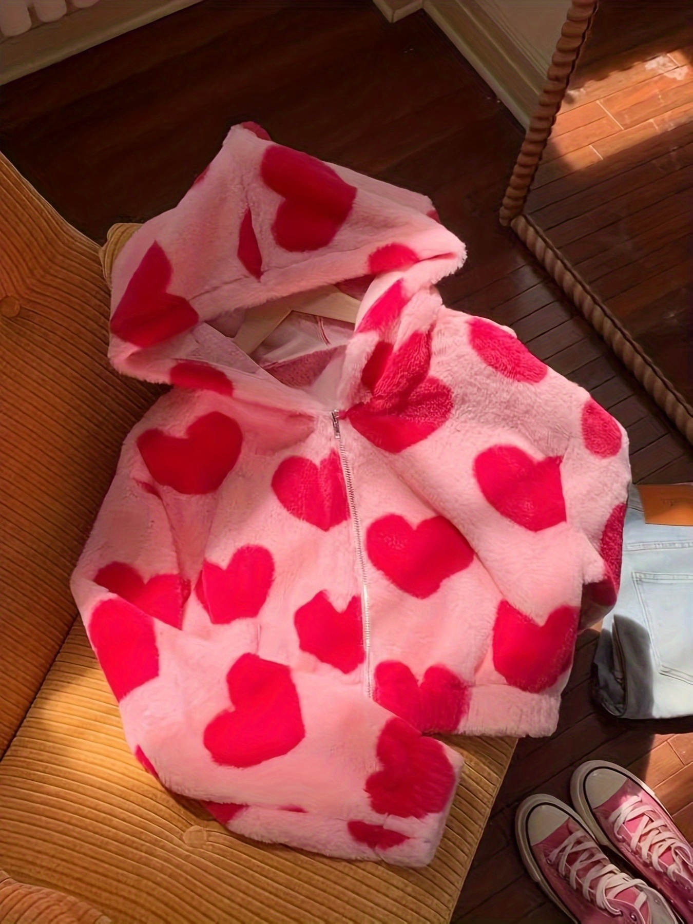 Women's Pink Heart Pattern Plush Hooded Jacket - Cozy Winter Zipper Front Casual Outerwear, Machine Washable Regular Fit Sleeve for Autumn & Winter