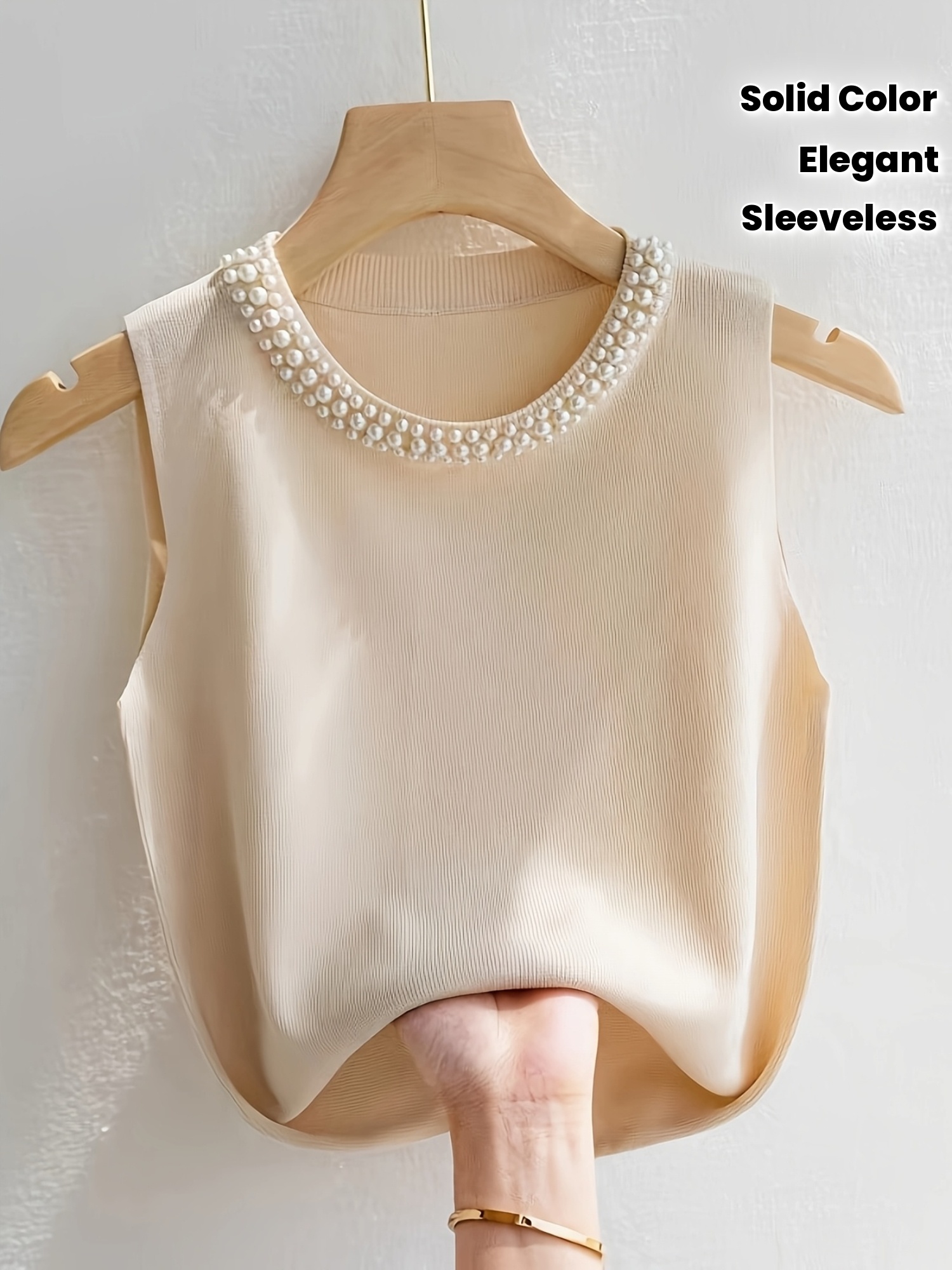 Women'S Elegant Beaded Sleeveless Vest - Solid Color Crew Neck Pullover for Spring/Summer/Fall, Chic Layering Piece with Pearl Embellishments