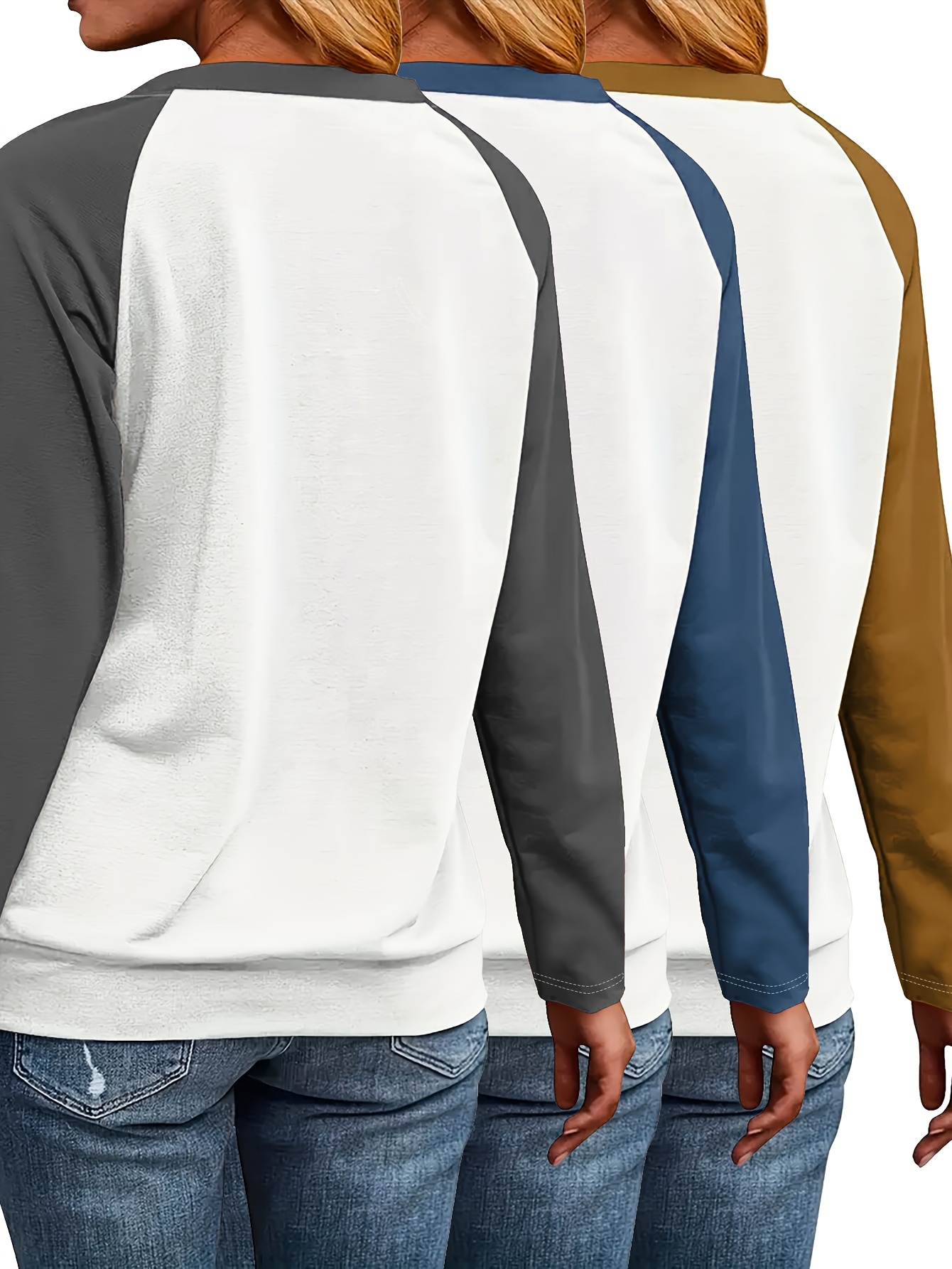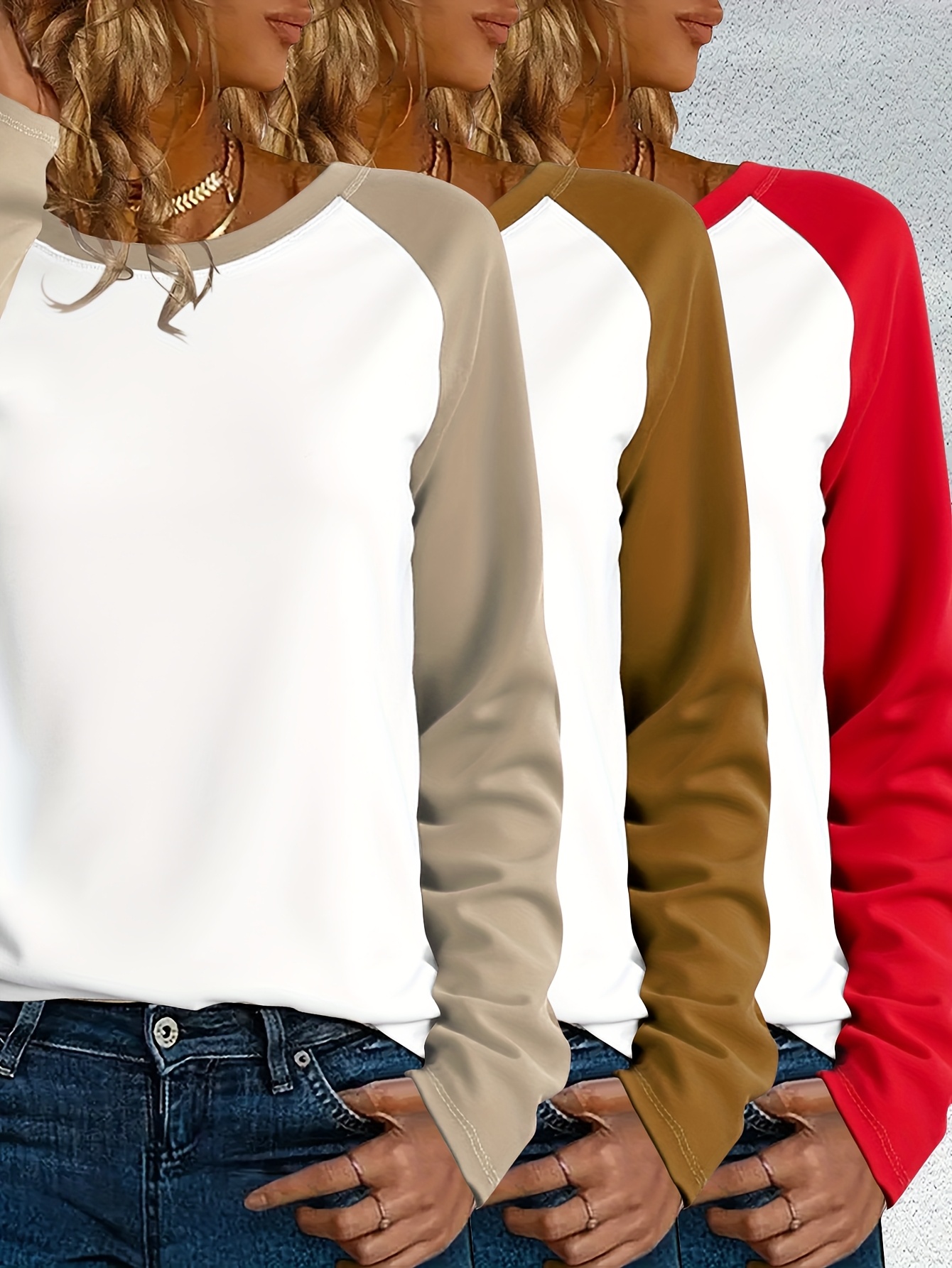 [3pcs Women's T-Shirt Set] 0623Gwen Women's 3pcs T-Shirt Set | Casual Color-Block Long Sleeve Tops, Solid Colors, Machine Washable, Wear Alone Layered, All Seasons, Autumn/Winter