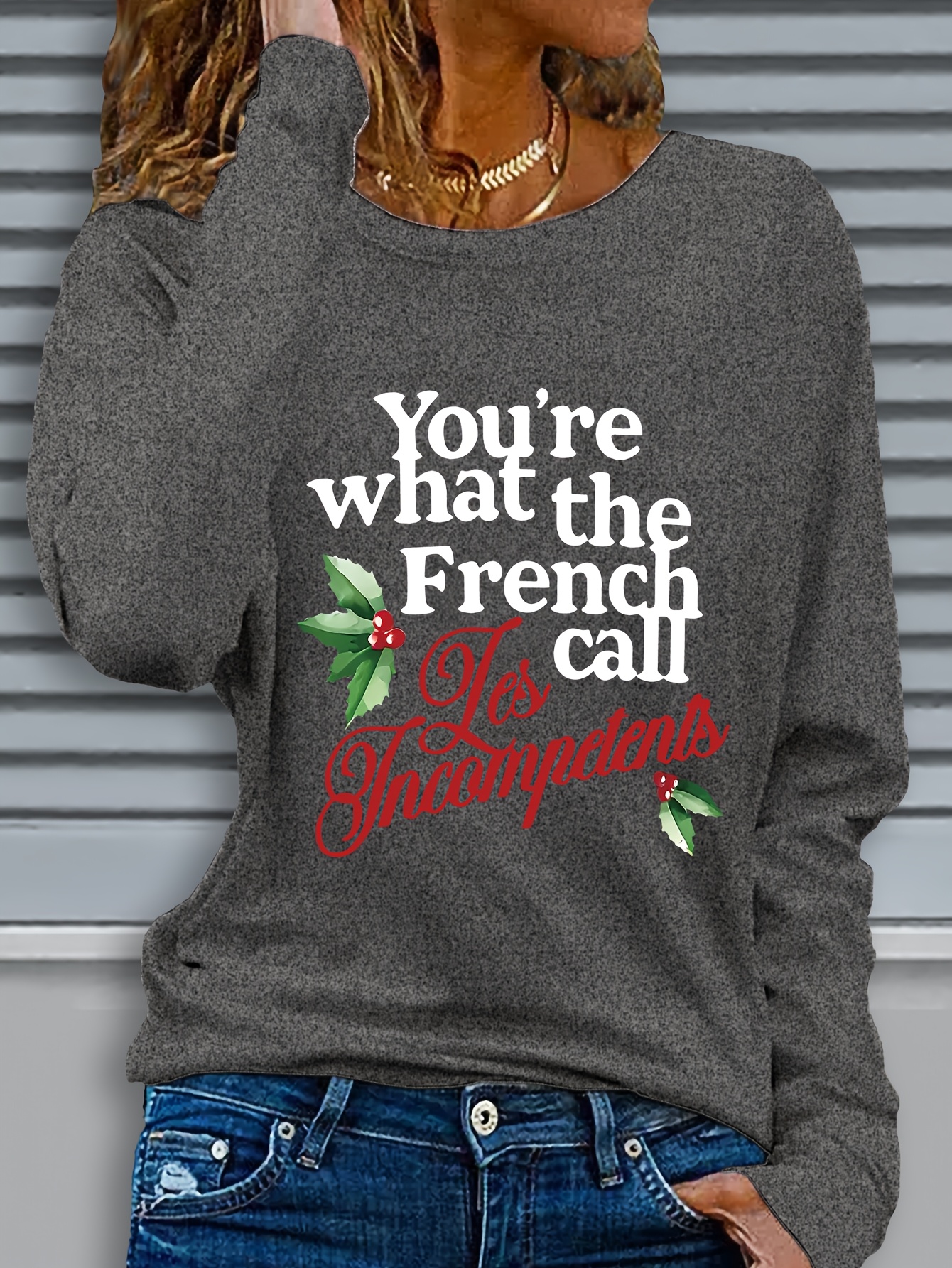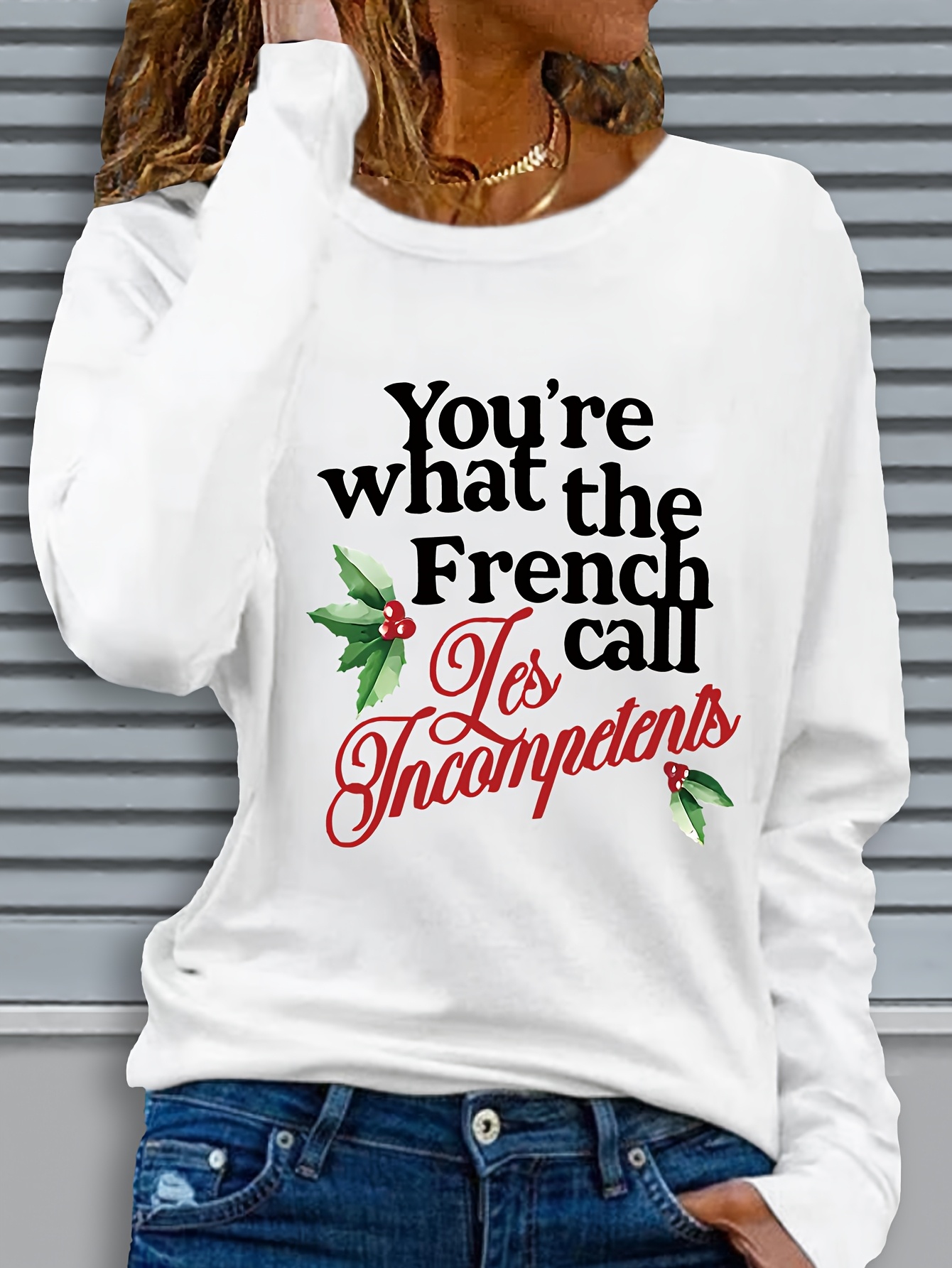 1pc Women'S Long Sleeve Crew Neck Casual Top with "You're What the French Call Les Incompetents" Graphic Print, Polyester Knit Fabric, Slight Stretch, Regular Fit, Christmas Themed Applique, Fall/Winter Collection