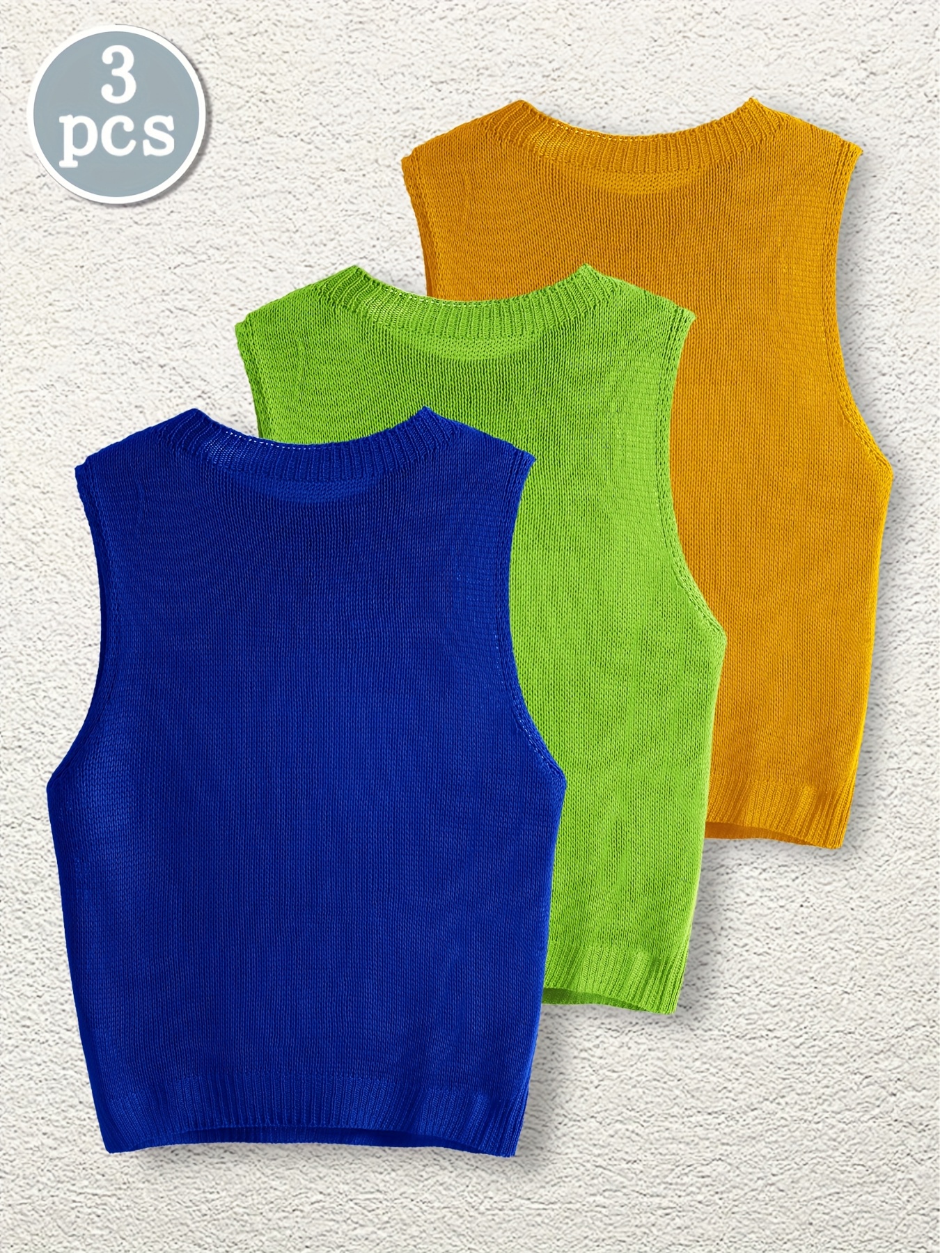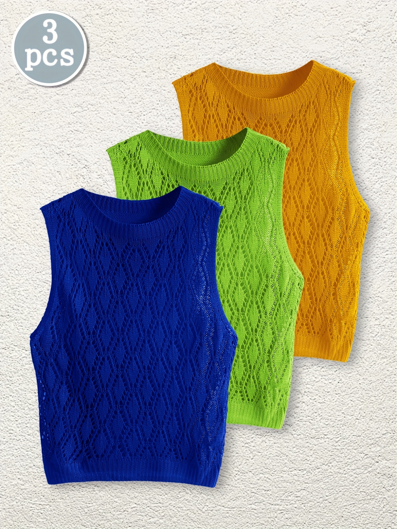 [3pc Summer Women's Set] TD7866-1T Women's Summer Three-Piece Set | Fashionable Lightweight Hollow Knit Pullover & Beach Vacation Tank Top