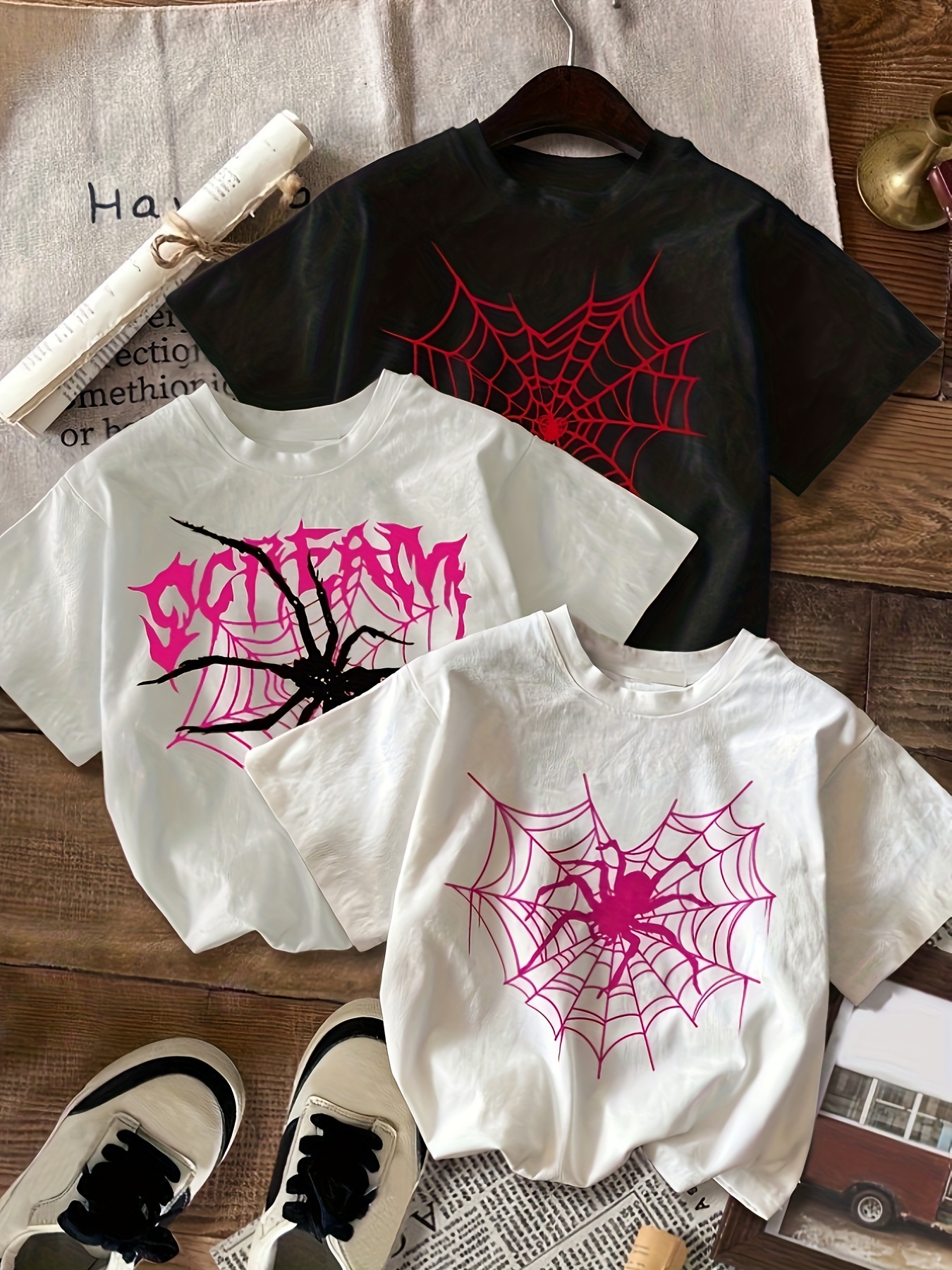 3pcs set Spider & Spider Web print t-shirt, short sleeve crew neck casual top for summer & spring, Women's clothing