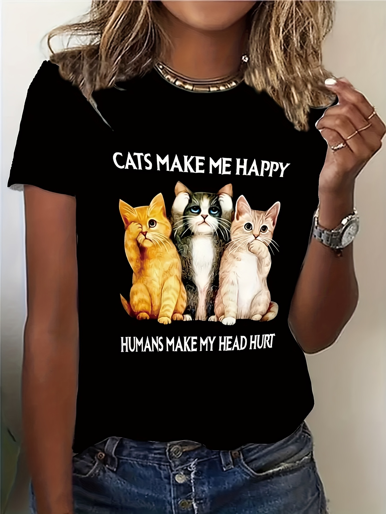 [Cute Cat T-Shirt] Soft Women's Casual Short Sleeve T-Shirt | Cute Cat Print & "Cats Make Me Happy" Humorous Graphic, Machine Washable Regular Fit Tee for Cat Lovers, Playful Fashion, Fun Design, Breathable Material, Cat-themed Apparel