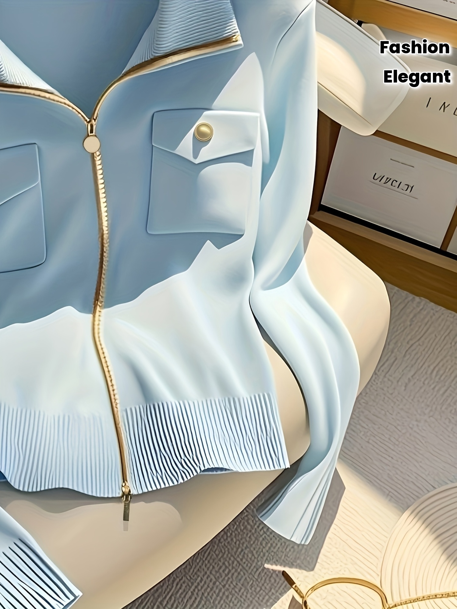 [Elegant Cardigan] Chic Elegant High-Neck Zip-Up Cardigan for Women | Long Sleeve Sweater with Chain Detail, Solid Blue, Perfect for Fall/Winter