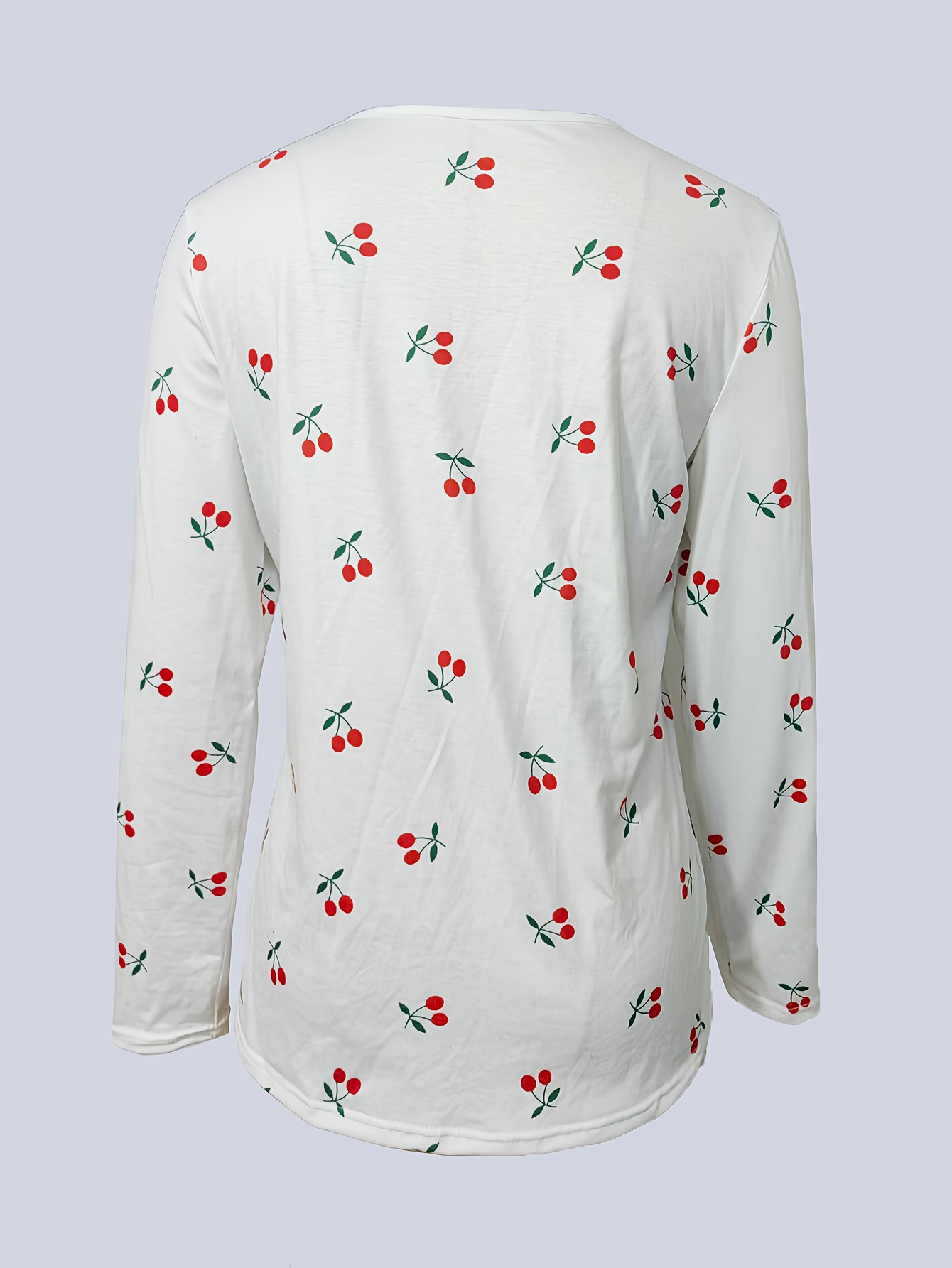 [Elegant Cherry Print T-Shirt] Elegant Women's Cherry Print Long Sleeve T-Shirt | Back Zipper, White with Red Cherry & Black Leaf Design, Round Neck Spring/Fall Layering Top, Regular Fit Casual to Semi-Formal Blouse