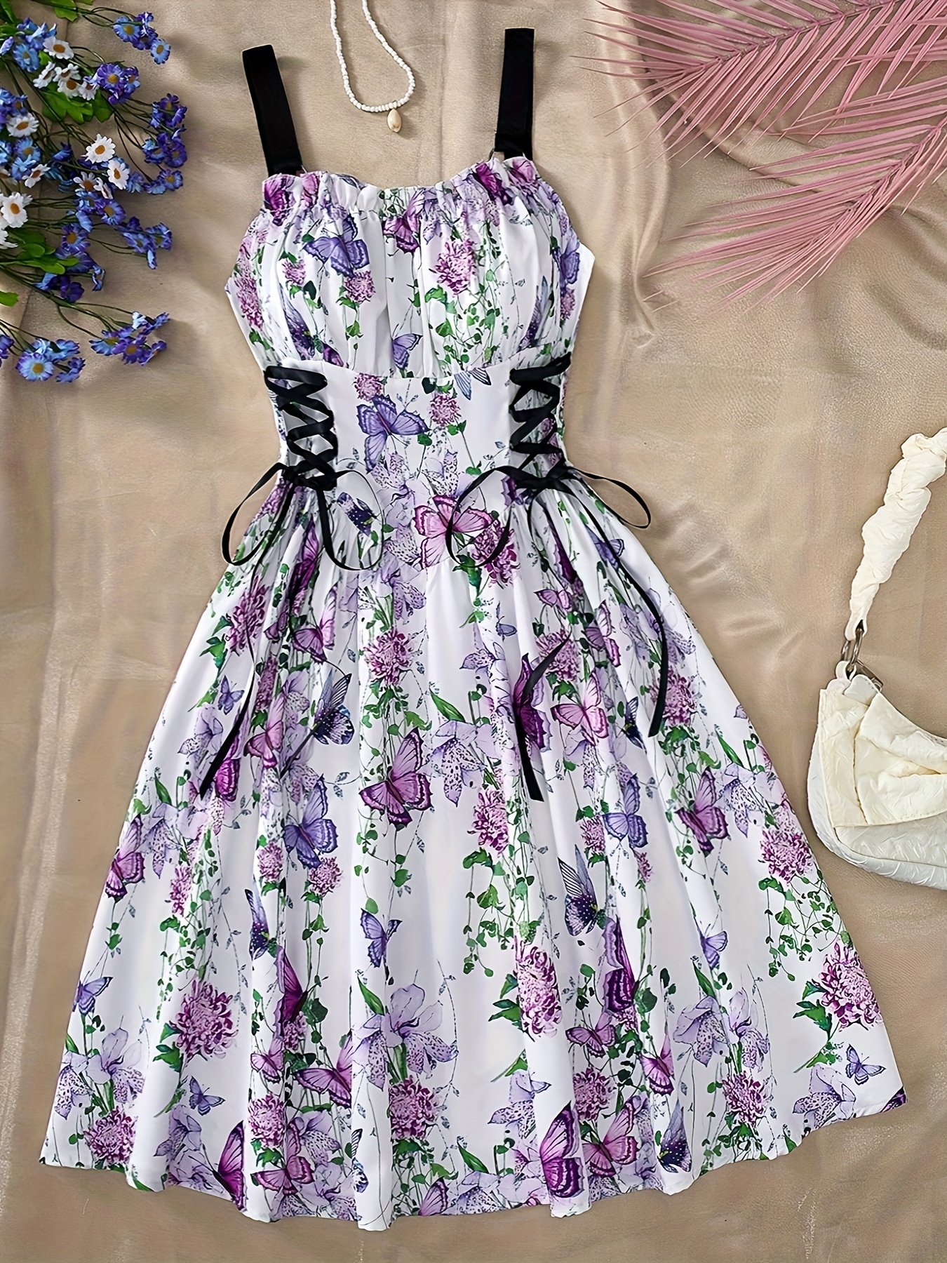[Elegant Floral Dress] Elegant Floral A-Line Dress | Butterfly Accents, Adjustable Cross Straps, Ruched Waist, Perfect for Beach, Vacation, and Party Wear