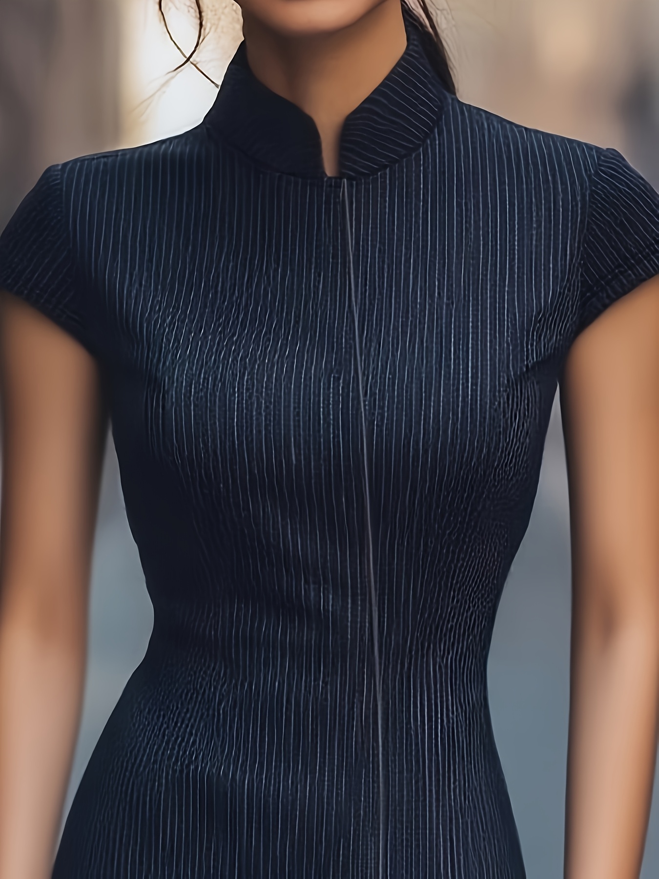 [Elegant Striped Dress] Elegant Women's Striped Dress with Pockets | Zip-Up, Stand Collar, Long Sleeve, Ribbed Texture, Black & White Vertical Stripes | Casual or Formal Occasions, Ladies Dresses