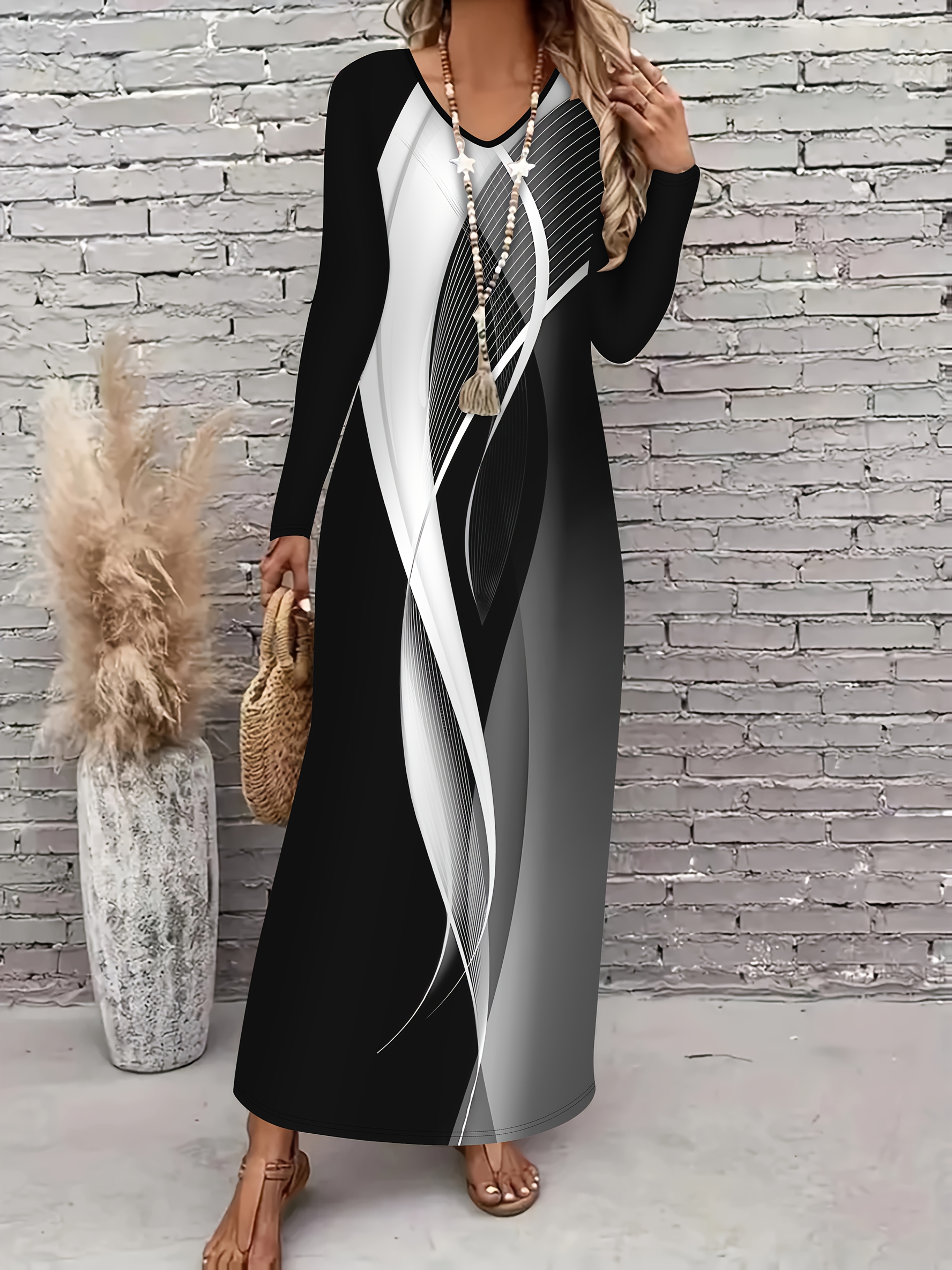Elegant Women'S V-Neck Long Sleeve Dress with Artistic Ellipse Print - Black & Gray Polyester, Flowy A-Line Cut, Perfect for Fall/Winter Fashion, Stylish Outfit | Flowy A-Line Dress | Polyester Fabric