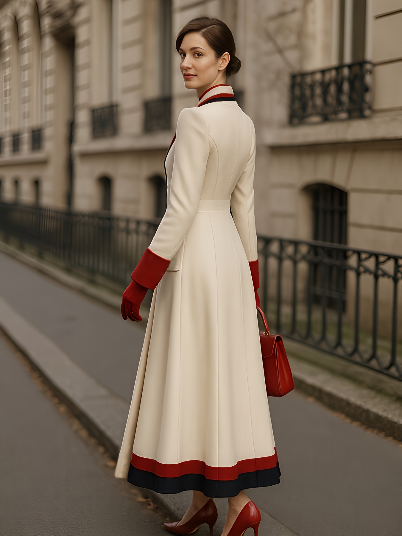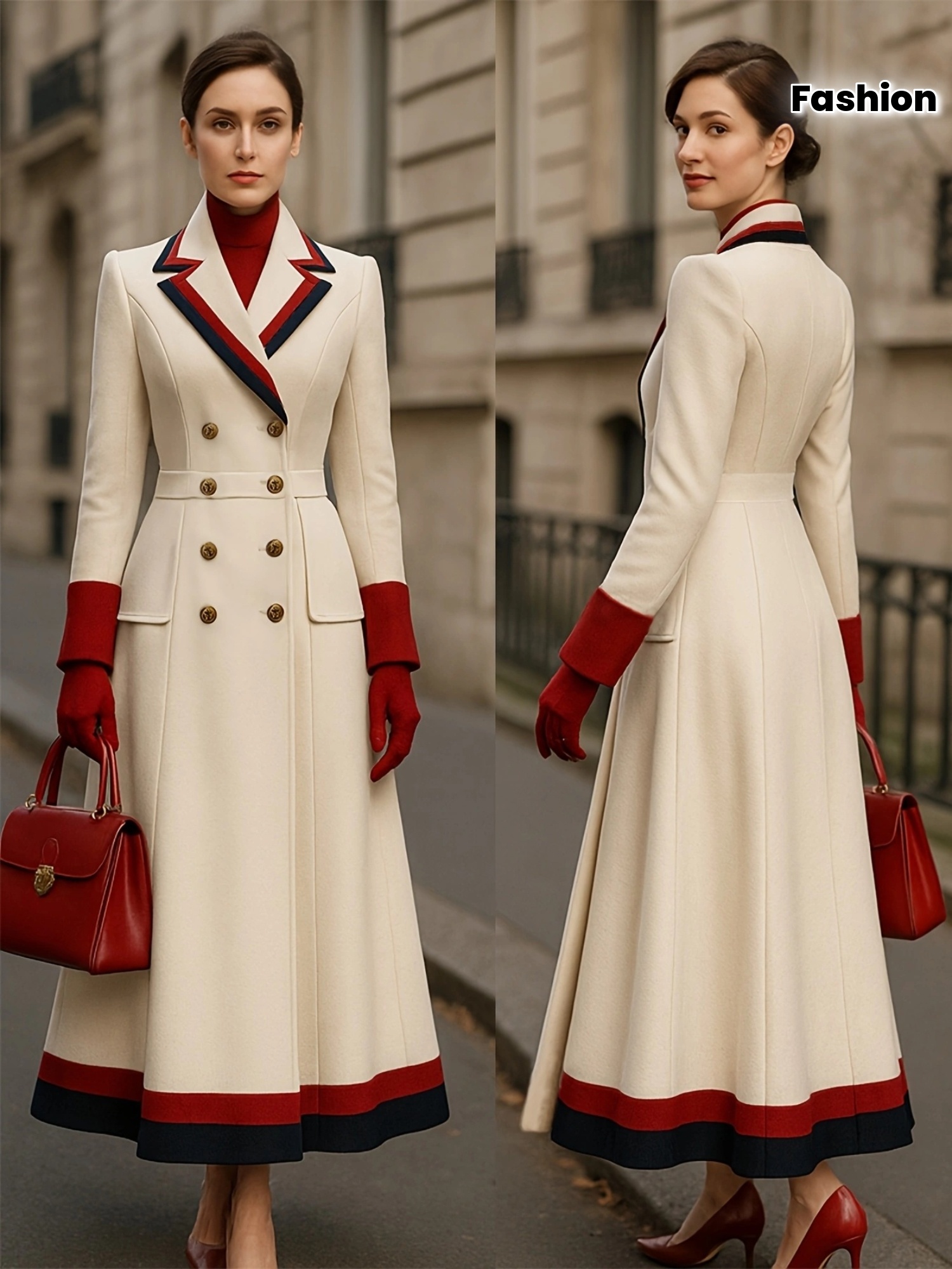 Fashion Trendy Color Blocked French Style Metal Double-Breasted Longline Peacoat