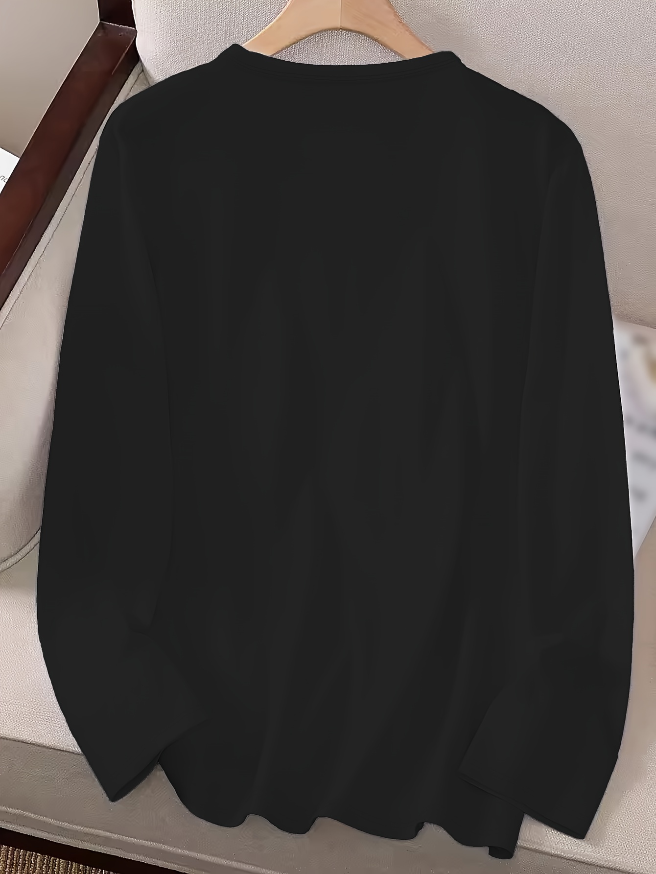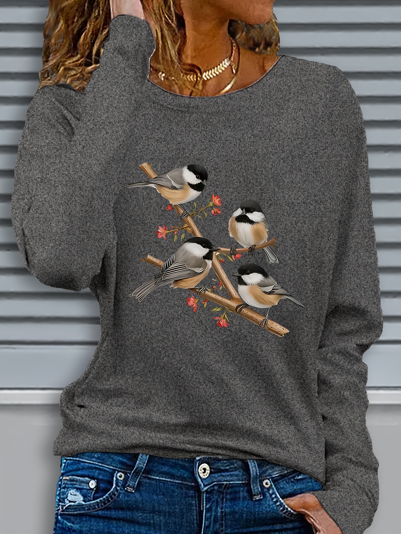 Women's Black Long Sleeve Crew Neck T-Shirt with White & Grey Titmouse Bird & Red Berry Graphic Print - Soft Casual Fall Winter Top, Machine Washable Everyday Comfortable Shirt for Nature-Inspired Outfits