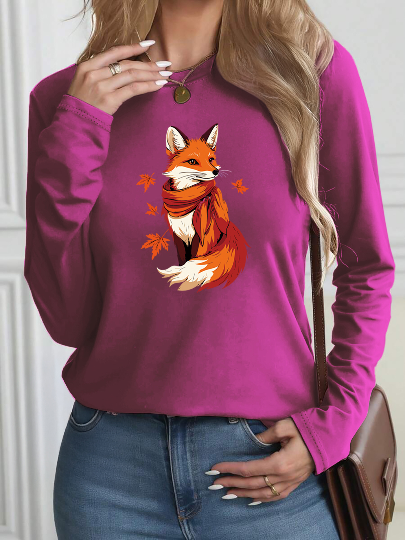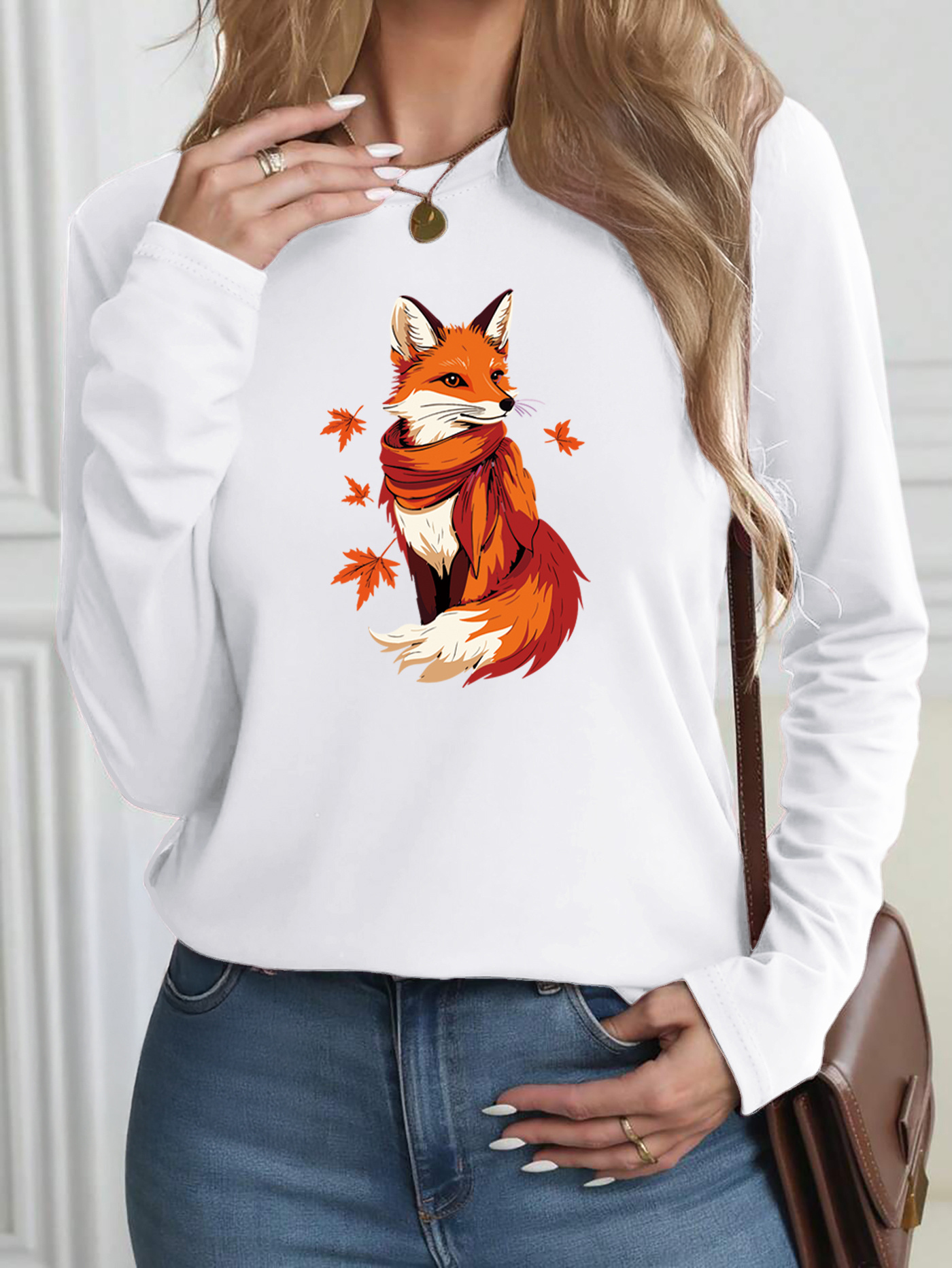 Women's Casual Long Sleeve T-Shirt with Fox & Maple Leaf Geometric Print - Vibrant Orange & Red on Grey, Round Neck, Machine Washable, Spring/Summer Vacation & Casual Attire, Versatile Streetwear, Spring Summer Apparel, Comfortable Fabric