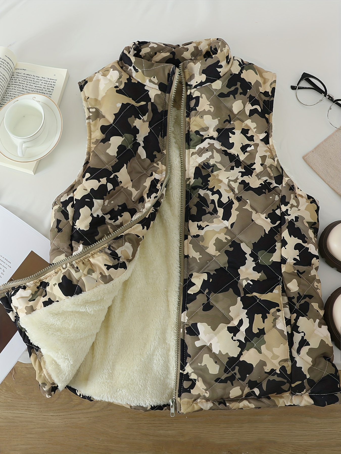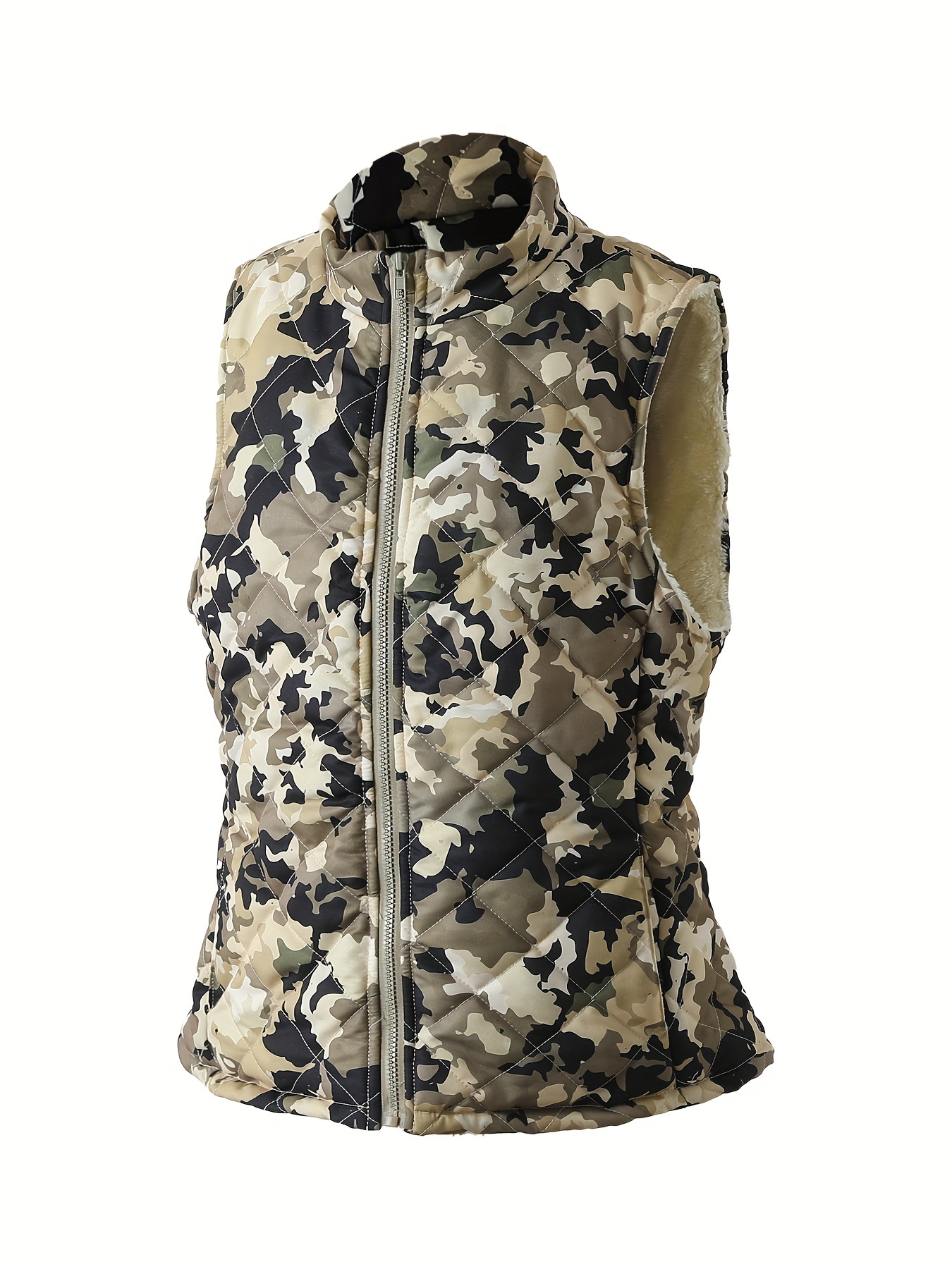 Women'S Lightweight Quilted Zip-Up Vest - Sleeveless, Stand Collar, Camouflage Print, Casual Style, Non-Stretch Fabric, Perfect for Fall/Winter, Casual Wear Vest|Quilted Vest|Zippered Vest