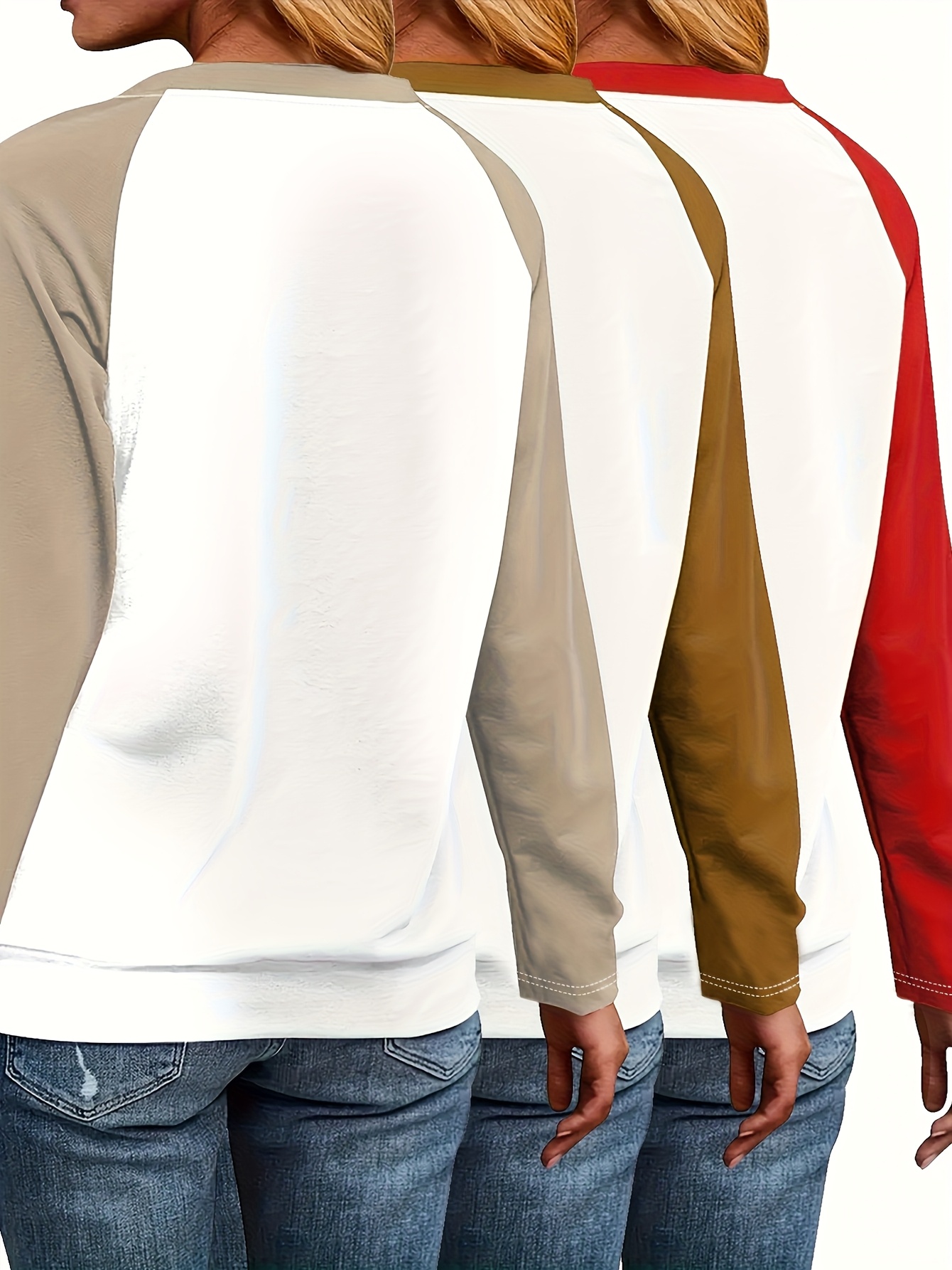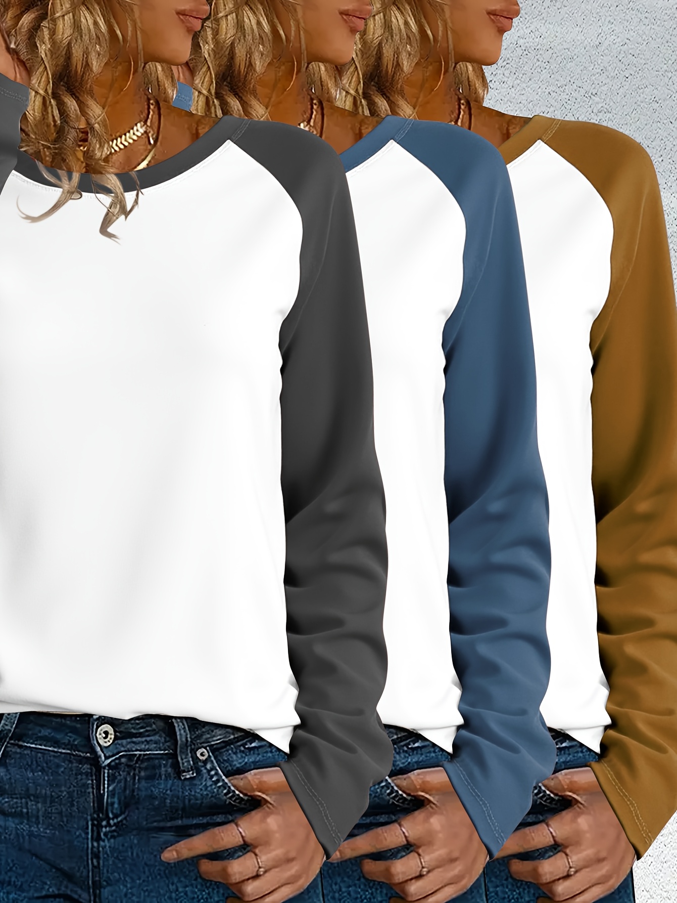 [3pcs Women's T-Shirt Set] 0623Gwen Women's 3pcs T-Shirt Set | Casual Color-Block Long Sleeve Tops, Solid Colors, Machine Washable, Wear Alone Layered, All Seasons, Autumn/Winter